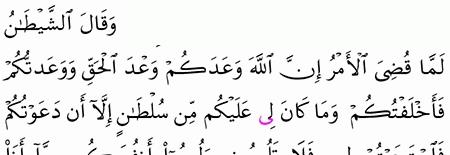 وقال الشيطان لما قضي الأمر إن الله وعدكم وعد الحق ووعدتكم فأخلفتكم وما كان لي عليكم من سلطان إلا أن دعوتكم فاستجبتم لي فلا تلوموني ولوموا أنفسكم ما أنا بمصرخكم وما أنتم بمصرخي إني كفرت بما. وقال الشيطان لما قضي الأمر إن الله وعدكم وعد الحق ووعدتكم فأخلفتكم وما كان لي عليكم من سلطان إلا أن دعوتكم فاستجبتم لي فلا تلوموني ولوموا أنفسكم ما أنا بمصرخكم وما أنتم بمصرخي إني كفرت بما أشركتموني من قبل إن الظالمين. وقال الشيطان لم ا ق ضي الأمر إن الله وعد ك م وعد الحق ووعد ت كم فأخلفت كم وما كان لي عليكم من سلطان إلا أن دعوت كم فاستجب ت م لي فلا تلوموني ولوموا أنفس كم ما أنا بمصرخكم وما أنتم بم صر خ ي إن ي كفرت بما. سمعت محمد بن كعب القرظي يقول.