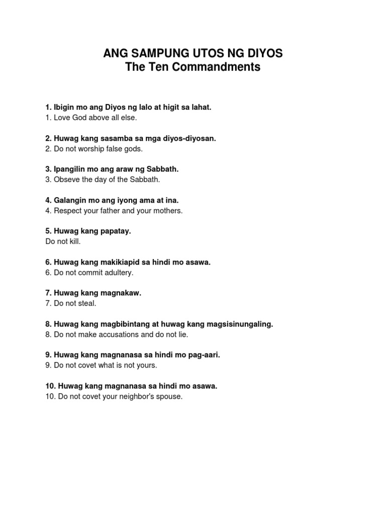Ang sampung utos ng diyos ay ang buod ng 613 kautusang nilalaman ng batas mula sa lumang tipan. Ang sampung utos ng diyos. They are the ten commandments giv. Huwag kang magkaroon ng ibang diyos bukod sa akin.